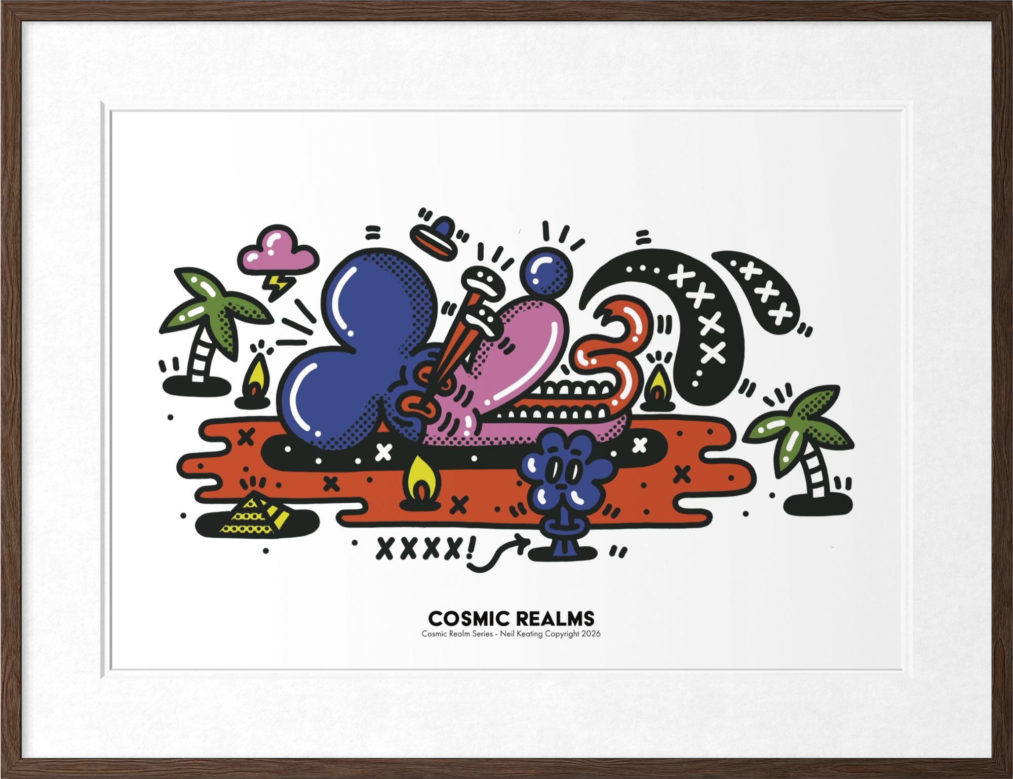 Part of the Cosmic Realms series, this piece brings together abstract characters and graphic forms into a tightly balanced composition.