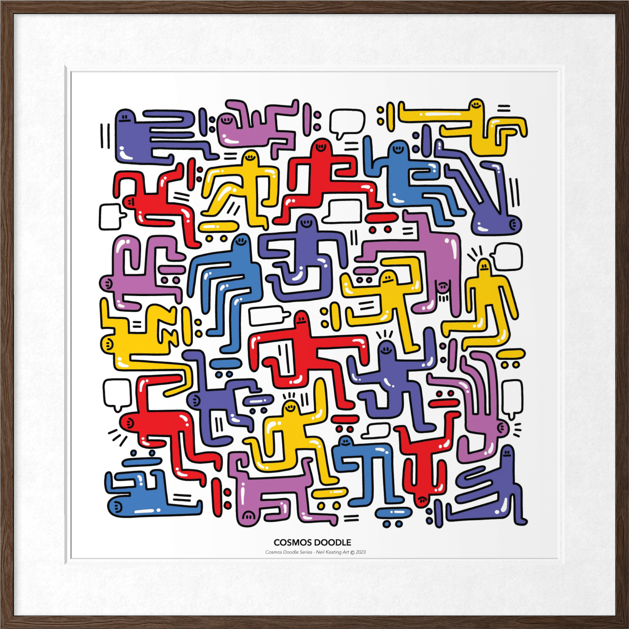 Part of the Cosmos Doodle Series, this piece explores movement and rhythm through a network of abstract figures. Free-flowing line work and bold colour create a balanced composition that feels both playful and considered.
