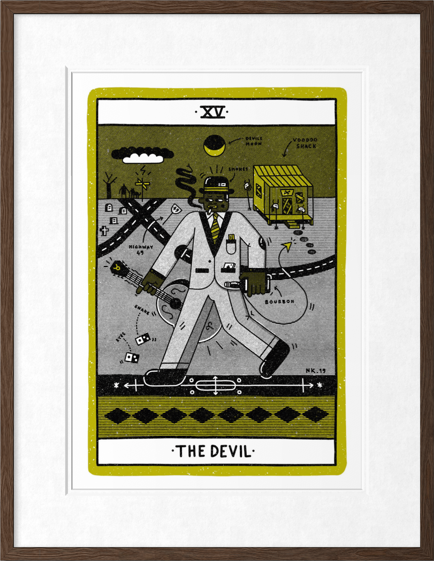 A two-colour screen print rooted in blues mythology and tarot symbolism.
